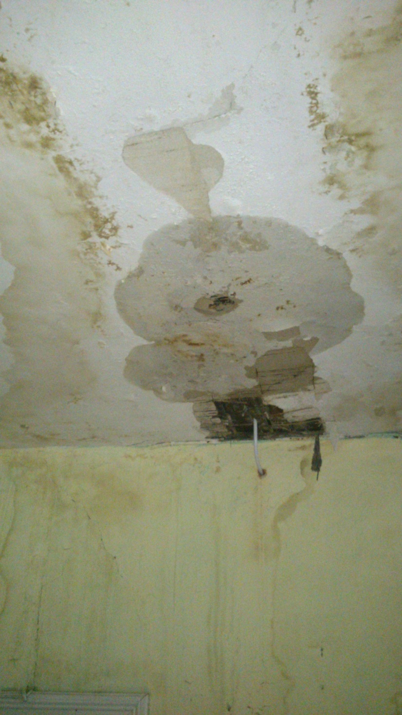 Zdjęcia pokazują zalany sufit oraz wodę na podłodze.
